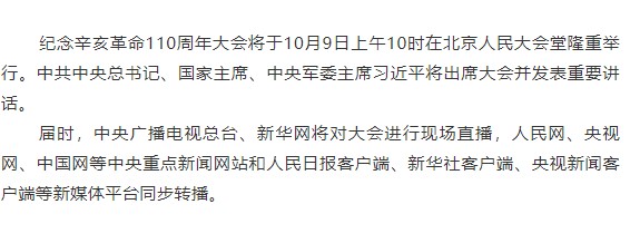 纪念辛亥革命110周年大会将于10月9日上午10时在北京人民大会堂隆重举行。中共中央总书记、国家主席、中央军委主席习近平将出席大会并发表重要讲话。 届时,中央广播电视总台、新华网将对大会进行现场直播,人民网、央视网、中国网等中央重点新闻网站和人民日报客户端、新华社客户端、央视新闻客户端等新媒体平台同步转播。
