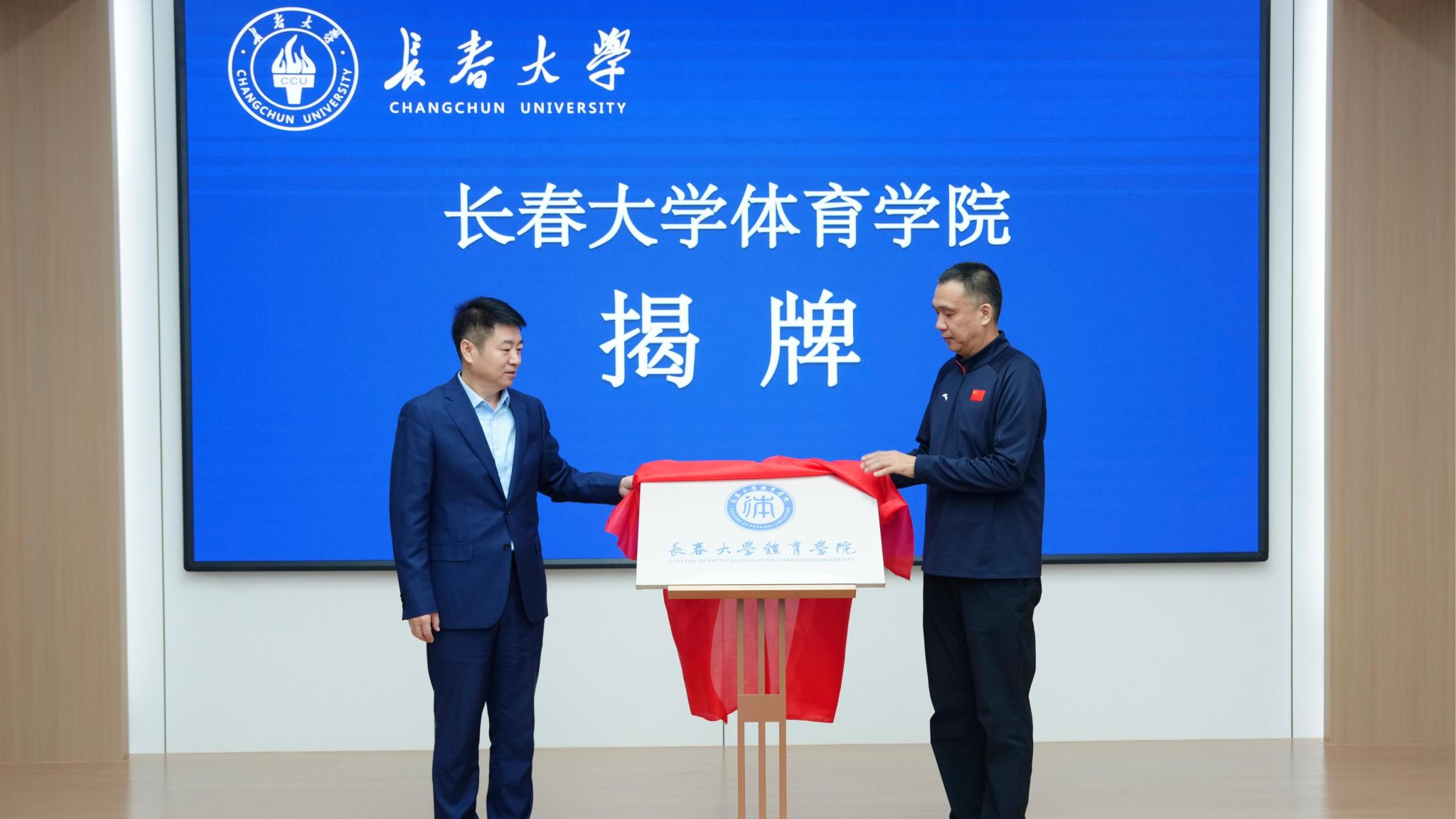 韩业与刘琦共同为长春大学体育学院揭牌。