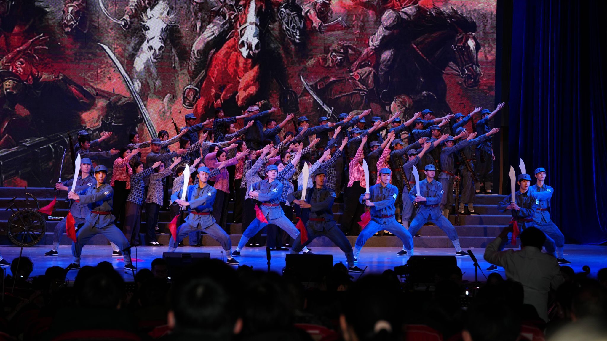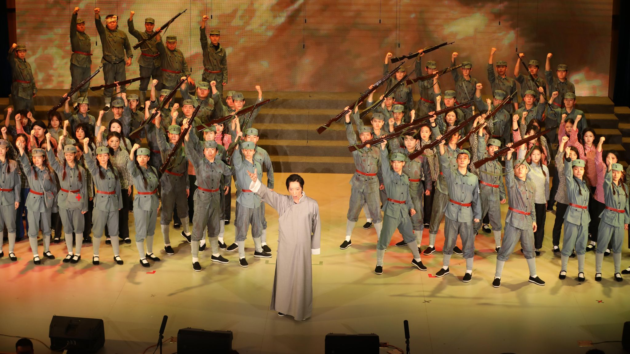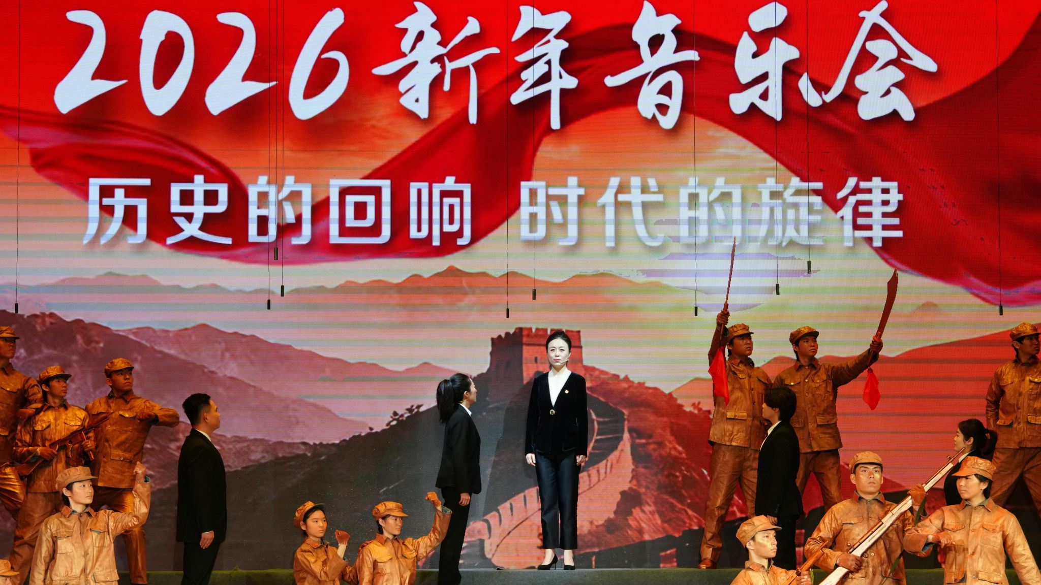 本次新年音乐会以“历史的回响,时代的旋律”为主题,创新融合交响合唱、戏剧、舞蹈与多媒体艺术形式,通过“情景合唱剧”模式,将观众带入抗战时期的烽火岁月,感受中华民族不屈不挠的抗争精神,重温通向伟大胜利的壮阔征程。