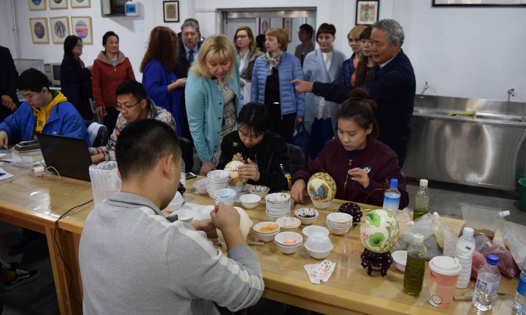 会谈结束后,访华团一行参观了我校特殊教育学院蛋雕工作室、师生作品展馆、特教30年发展成果展以及针灸推拿室,并来到我校叶赛宁文化教育中心,观看了我校学生表演的叶赛宁诗歌朗诵。