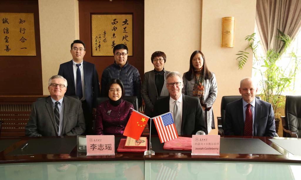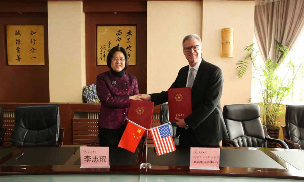 会谈中,李志瑶向来访客人介绍了长春大学的办学理念以及近年来学校在教学、科研方面取得的成绩。卡斯尔伯里表示,西雅图西北大学与长春大学的办学理念非常相近,都有对学生和教职员工“爱”的教育,双方都重视国际合作,希望两校的合作能为双方师生带来更多的交流机会。李志瑶和卡斯尔伯里签署了两校合作交流协议,为两校在教学、科研、创业创新方面的合作搭建了平台。