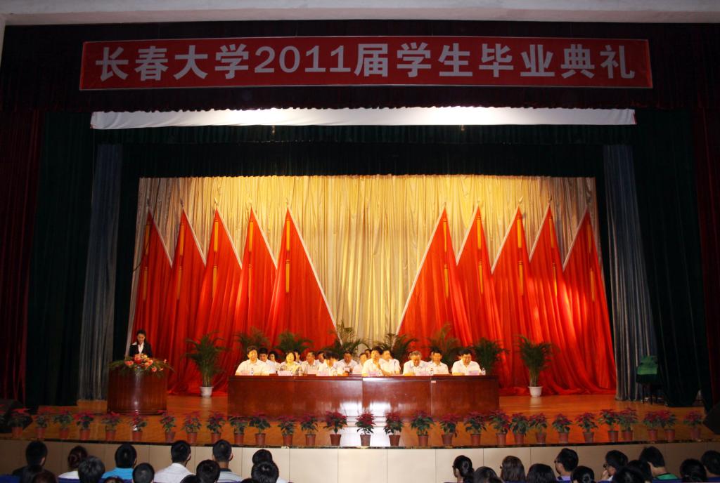 毕业典礼开始前,音乐学院学生表演了精彩的文艺节目。毕业典礼伴随着雄壮的国歌拉开帷幕。副校长李志瑶宣读了《长春大学关于准予毕业和授予学位的决定》;党委副书记郑永奎宣读了《长春大学关于表彰2011届优秀毕业生的决定》。学校领导为准予毕业、获得学士学位的毕业生代表颁发了毕业证书和学位证书,为优秀毕业生颁发了荣誉证书和奖品。毕业生代表、长春市文明大学生、音乐学院学生刘芳,在校生代表、校学生会主席田桦和教师代表、电子信息工程学院院长张丽英教授相继发言。