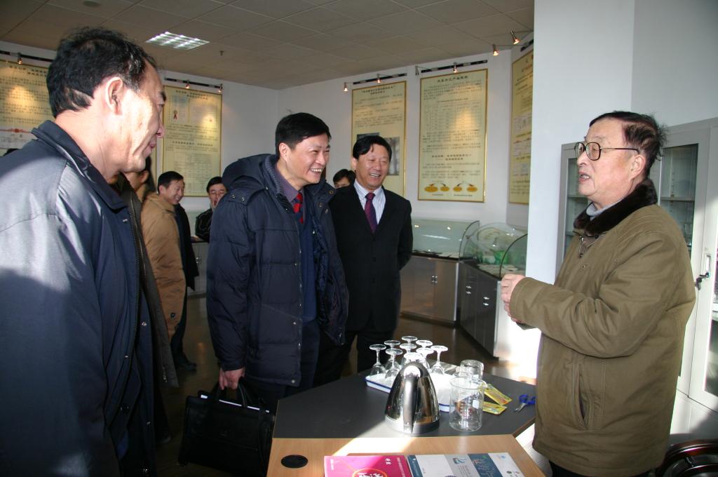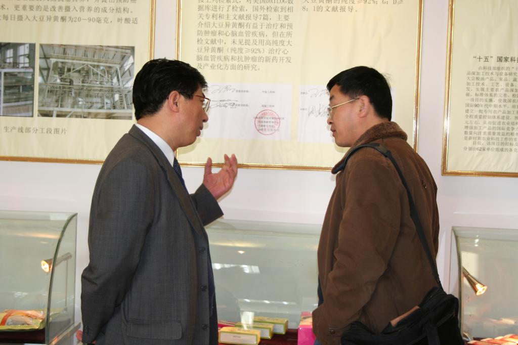 国家有突出贡献专家、五一劳动奖章获得者李荣和教授向专家介绍采用学科科研成果所生产的功能性食品