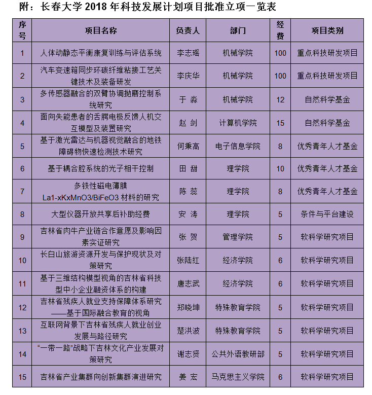 日前,吉林省科技厅公布了2018年吉林省科技发展计划项目评审结果,我校首次获得重点科技研发项目2项、自然科学基金项目2项、优秀青年人才基金项目3项、大型仪器开放共享后补助项目1项、软科学研究项目7项,共计批准立项15项,总资助经费296万元。此批项目的成功立项是我校在省科技厅年度立项数目最多、获资助经费总额最多、单个项目资助额度最高的一次。对我校青年教师培养、科研人才锻炼、学科发展、研究生培养、提高教师从事...